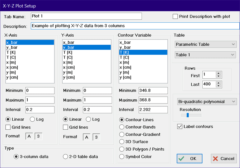 If the 3-column data radio button is selected, EES will expect that three dimensional data to be provided in three columns chosen from one of the table windows. The X, Y, and Z variables are then selected from the three lists. Data provided in this form need not be in any particular order. If the 2-D table data radio button is selected, EES will assume the column numbers in the table are proportional to the X-coordinate whereas the rows are proportional to the Y-coordinate. If the Transpose button is checked, the column numbers in the table will be proportional to the Y-coordinate and the rows will be proportional to the X-coordinate. The Z-values will be read from the table. Controls are provided to allow a subset of rows and/or columns in the table to be plotted. The X and Y axis scaling is, by default, set from 0 to 1, but it can be changed as desired for the axis scale display.