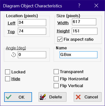 In the Professional license, the graphic object can be given a name. The name can then be used to assign attributes to the graphic item with EES variables in the Equation window or Parametric table. For example, the left and top of the item represented in the dialog below could be specified with EES variables GBox.left and GBox.top, respectively. If GBox.Hide is set to a non-zero (true) value, the object is not displayed. (Objects are visible and return to the location specified in the dialog when the Diagram window is in development mode). The values of EES variables that are used in this manner can be conveniently set using a Drop-Down list item. A common use for this capability is to have EES display one of several pictures, depending on the selection from the drop-down list. An example of this capability is provided in the Movable_Figures.EES example file. This example can be opened by selecting Diagram Window from the Examples menu and then selecting the Movable Figures item. A more powerful application of this capability is animation.