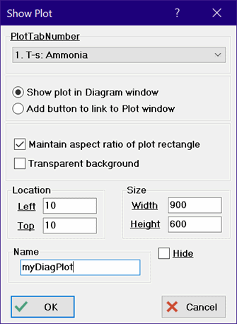 If the Show Plot in Diagram window is selected (as shown on in the figure on the right), the selected plot will be displayed in the Diagram or child Diagram window and it will be automatically updated when the Plot window is updated. This capability is only available in the Professional license. The location and size of the plot can be specified using the edit controls at the bottom of the dialog. In addition, the plot can be dragged to a desired location and resized in the same manner as for any of the other graphic items while in the Development mode. If the Maintain aspect ratio check box is selected, the height to width ratio of the plot will be maintained when the plot is resized. If the Transparent background check box is selected, the plot will be drawn in the Diagram window in a transparent manner so that the contents of the Diagram window behind the plot can be seen.