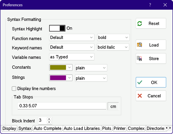 Constants syntax is controlled with two drop-down boxes. The first controls the color and the second controls the font style as they appear in the Equations window. The case of the constants (which are identified with # as the last character in the name) are changed to match the case in the Constants dialog.