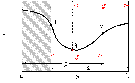 Now point 3 is located at a position g away from the right bound and the process is repeated until one of the stopping criteria terminates the search.