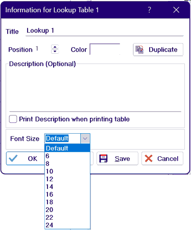 Select the desired font size from the drop down menu. The font size will be saved with other table information in the EES file.