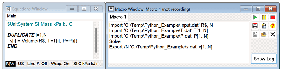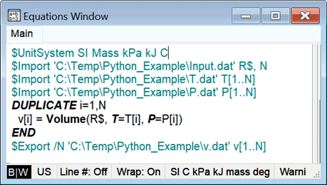 A simple example is used here to illustrate all of the options in the Python-EES communication. Python writes the name of a refrigerant (R$) and number of data points (N) in file Input.dat along with arrays of N temperatures and pressures in files T.dat and P.dat. When called from Python, EES reads these files with its $Import directive or Import macro command. EES uses the temperature and pressures to calculate an array of specific volumes, which are exported using the $Export directive or Export macro command to file v.dat. Python waits for EES to complete the calculations and then imports file v.dat. It should be understood that Python and EES can be modified to exchange any desired information in any number of files .