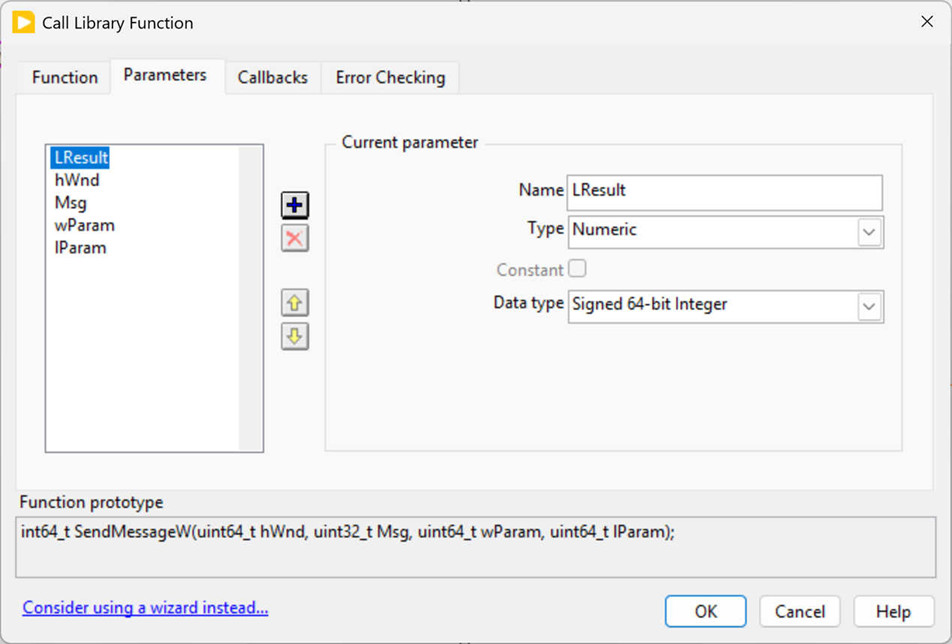 The second panel runs the python code GetEESHandle.py using the System Exec vi (10). The command line to execute is: python "C:\LabViewExample\GetEESHandle.py" and the python code writes the windows handle to the standard output which is then converted to an unsigned integer using the Scan from String vi (11). The Windows Handle is one of several inputs to the SendMessage command that is executed using the Call Library Function Node (12). The Call Library Function node has to be setup carefully, as shown in the screenshots below. The library name is user32.dll and the command to send is SendMessageW using the standards Windows API format. The parameters include the output LResult (a signed 64 bit integer), the Windows handle hWnd (an unsigned 64-bit integer), the identifier message Msg (an unsigned 32-bit integer), the command wParam (an unsigned 64-bit integer), and the extra parameter lParam (an unsigned 64-bit integer).