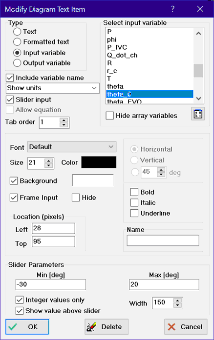 In the Professional license, numerical values for EES variables can be set in the Diagram window with slider controls, in addition to the conventional edit box. Here is how it is done.