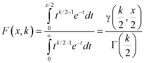 where g is the lower incomplete Gamma function and G is the Gamma function. The CHI_SQUARE function is further defined in Abramowitz and Stegun, "Handbook of Mathematical Functions", Dover Publications, 10th printing, 1972.