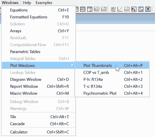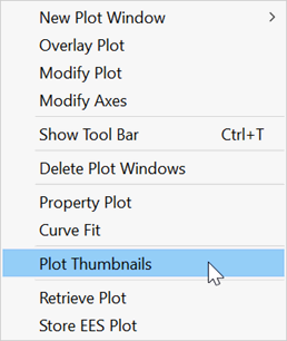 Sometimes it is necessary to view two plots at the same time. The EES plot window does not provide this capability. However, the Plot Thumbnails window can be opened and enlarged to view one of the plots and it can then be compared with a different plot in the EES plot window.