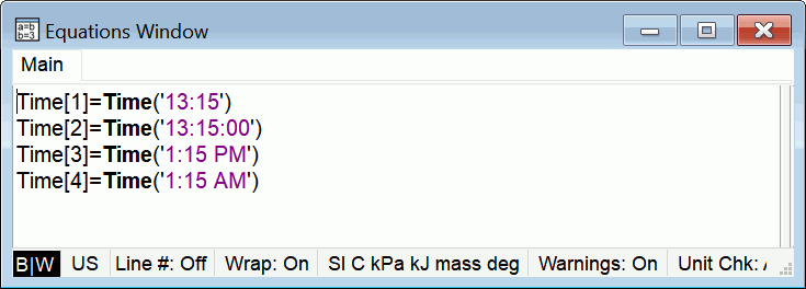 The Time function accepts a string constant or string variable representing a time and converts it into a number. Time are internally stored as a real number,normally ranging between 0 and 24. The Time function accepts the string representation of the time in several formats as illustrated in the following example.