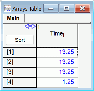 After running this program, the Arrays table will appear showing the numerical equivalent of the entered values of time. The entries are displayed as decimal because the display format for the Time array is initially set to Auto, which is a numerical format.