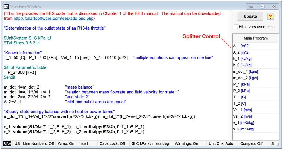 The width of the palette can be adjusted by dragging the Splitter Control to the desired position. Dragging the splitter bar all the way to the right of the window frame hides the palette. The width of the palette is saved in the EES file. When EES is restarted, the width of the palette will be the value it was when EES was last used.