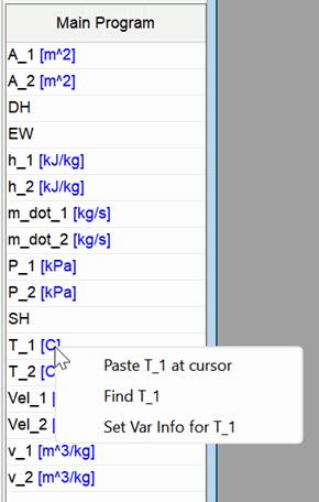 Clicking the right mouse button on a variable in the list will find and select the variable in the Equations window. (This capability is the same as clicking the left mouse button and selecting Find from the pop-up menu, but it is faster since it is not necessary to click a second time on the popup menu. A click sound will be issued if the variable is found. This capability is similar to using the Find command in the Equations window, but it differs in that the find is restricted to the program unit (Function, Procedure, Subprogram, etc) that is selected on the top row of the Variable Information Palette. Right-clicking on the same variable again will find the next occurrence of the variable in the Equations window.