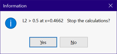 /n is optional. Without this specification, EES will display a dialog indicating when the condition has been met and offer the option of stopping or continuing the integration, as seen in the example. If /n provided, then EES will not display a dialog, but rather, just terminate the integration process.