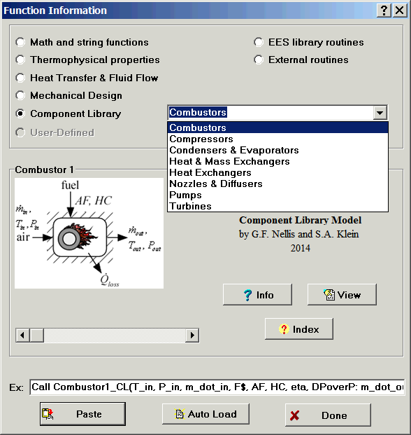 The Component Library is a collection of Functions, Procedures, and Subprograms that provide high level models of common components in energy systems. This library is only operational in the Professional license. Clicking on the Component Library button in the Function Information dialog will bring up the library index as shown.