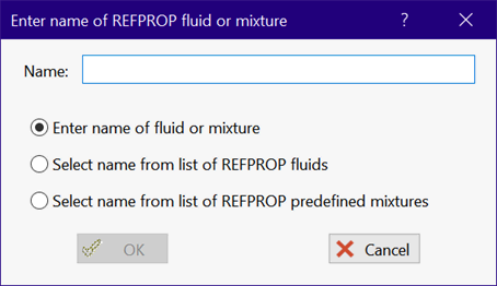 The dialog is displayed when entering a new flluid within the Property Plot dialog for the EES_REFPROP interface. There are three options, selected with the radio button control. The first option allows you to directly enter the fluid or mixture name into the edit box. If 'Select name from list of REFPROP fluids' is selected, a list of all fluids in the REFPROP\Fluids directory will be displayed. Clicking on a file name will copy the fluid name into the edit box. The last option provides the same capability for predefined mixtures in the REFPROP\Mixture folder. Note that REFPROP must be installed in its default location, i.e., C:\Program Files (x86)\REFPROP. Click the OK button to accept the selection.