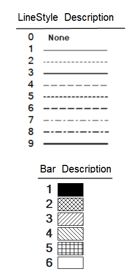 The values provided for LineStyle, Bar, Symbol, and Color can be specified using integers or variables. The color can be provided as either an integer or the name of the color. The coding for these parameters is as follows:
