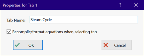 To change the name of a tab, or to change the settings for Recompile/format equations when selecting tab, right-click on the tab and select Properties from the popup menu. Change the tab name before using the Add Prefix command.