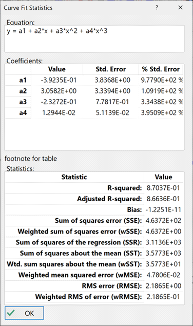 Once a curve fit has been established, the quality of the fit can be assessed by examining the results in the Curve Fit Table Results Dialog.