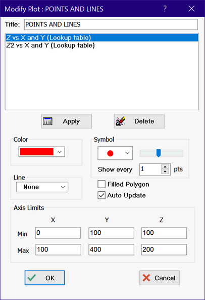 When the Automatic Update control is selected, the plot will use the current data in the table from which the plot was developed, rather than the data that existed in the table when the plot was first drawn. The data can be plotted from the Parametric, Lookup, Arrays, or Integral tables. Any change in the data will cause the plot to be redrawn before it is displayed.