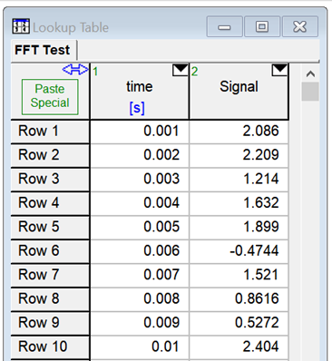 The Professional license provides the capability to do transform data in a column in the Lookup table using the Fast Fourier Transform (FFT) algorithm. The following example will illustrate this capability.