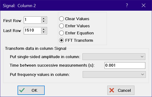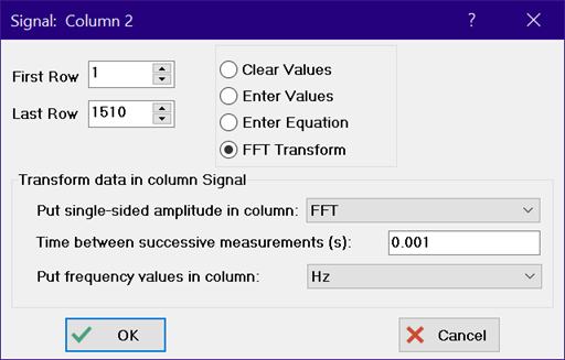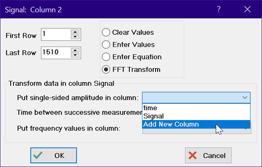 A Fast Fourier Transform of the data in the Signal column is desired. Click on the triangular icon at the upper right of the Signal column and select the FFT Transform radio button.