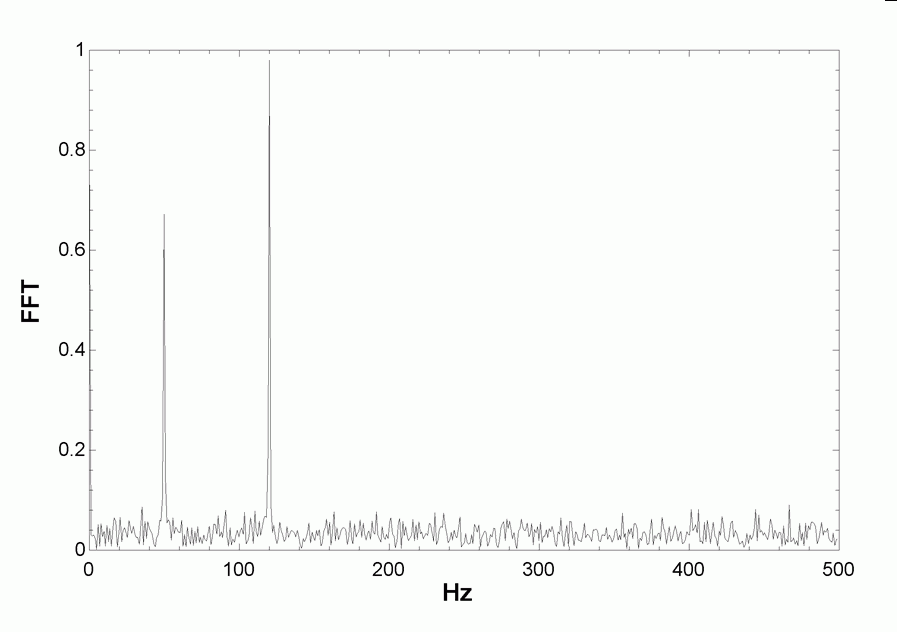 Note that the transformed data (which represent the single-sided amplitude of the complex transform) exhibit three peaks at frequency values of 0, 50 and 120 Hz. These peaks correspond to the steady-state value and the frequencies of the two sine contributions. The amplitudes of these peaks should be 0.8, 0.7 and 1.0, but differ slightly due to the noise in the signal.