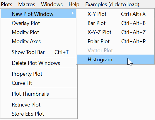 A histogram is created by selecting Histogram from the New Plot Window command in the Plots menu, as shown.