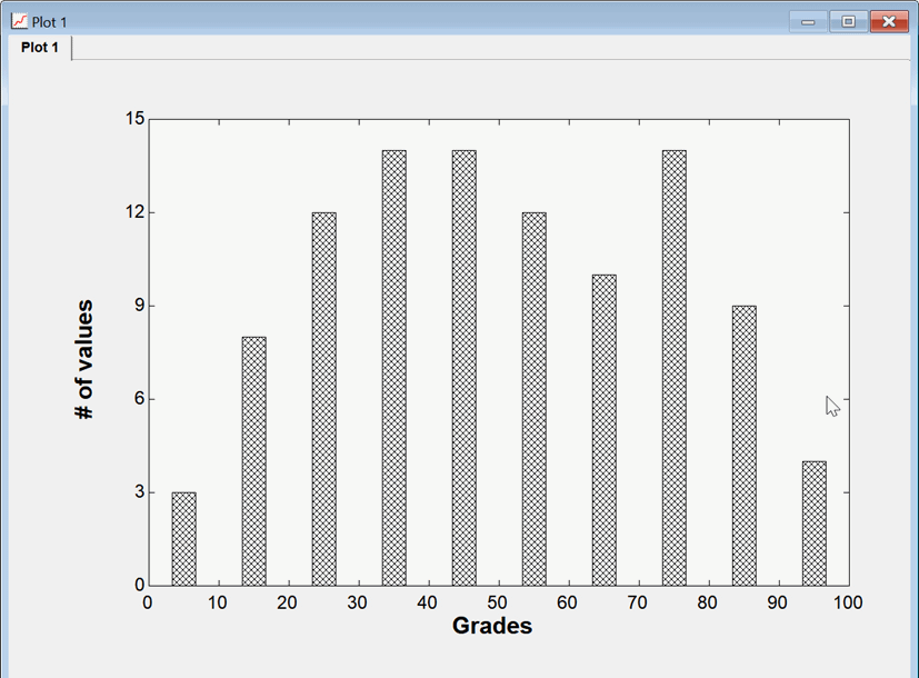 A histogram provides a bar chart showing the number of occurrences of values within specified intervals. For example, consider a column of values in a table that range from 0 to 100. The histogram plot can create bars indicating the number of values between 0 and 10, 10 and 20, and so on. A histogram can be created from any EES table. Only one column of values is required. String values cannot be used.