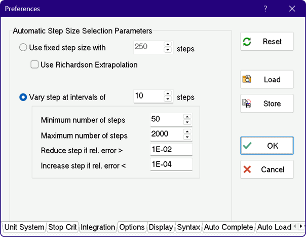 The parameters for the automatic step size adjustment algorithm can also be changed with the $IntegralAutoStep directive.