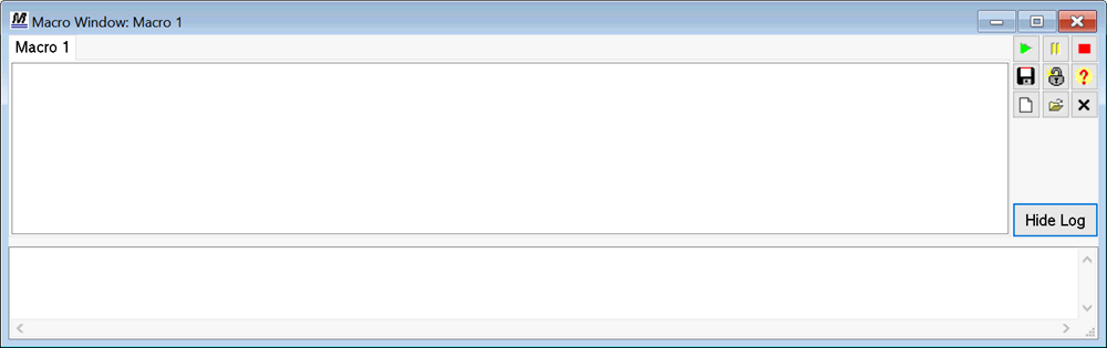 The Macro Window has a horizontal splitter bar. The upper window shows the macro commands. The lower window displays the log file as shown below. If you do not wish to see the log file, pull the splitter bar to the bottom of the screen or, more simply click the Log Window size control button shown in the figure below. If you want to restore the log window to its last position, again click the Log Window size control button.