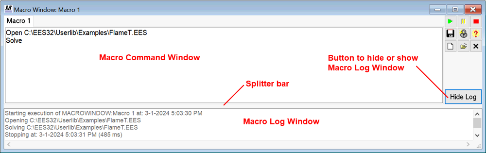 The macro command window is editable, so that you can modify the commands that appear in this window, add new commands or delete them if you wish. See the list of Macro Commands. Clicking the Play button will signal EES to play the macro commands that appear in the window starting at the top.