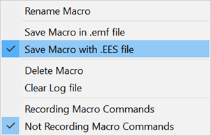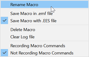 As of version 10.688, macro files can be saved with the.EES file, rather than in separate .emf files. By default, new macros are set to be saved with the .EES file. To save a macro in a separate .emf file, select the Save Macro in .emf file command. A check mark will be displayed to the left of the menu item showing which save option is selected. Also, if a macro is set to be saved in an .emf file, the .emf filename extension will appear in the tab name. References to the macro should use the same name as displayed in the tab. If the macro is set to be saved with the .EES file, then all of the information relating to the macro will be saved when the .EES file is saved and restored when the macro is opened. This option is convenient as it eliminates the need for providing and opening separate .emf files.