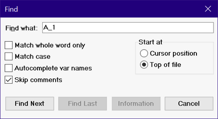 Find will search the Equations window for the first occurrence of the text entered in the 'Find what' input box. The search is case-insensitive unless the 'Match case' check box control is selected. The 'Match whole word only' check box control will, if checked, only find whole words which match the text. For example, if the text to find is A, text such as CAT will not be found when using 'Match whole word only'. If the 'Autocomplete var names' control is checked, the Find what edit box will suggest existing variable names that begin with the characters that have been entered. If the 'Skip comments' control is checked, text that is displayed in a color (such as blue for comments) will not be found. Note that Syntax Checking must be enabled to display text in color.
