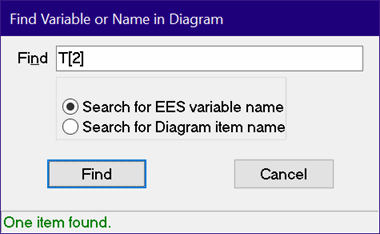 The Find command offers the choice (by clicking the appropriate radio button) of locating a Diagram window item that relates to a specified EES variable name or has a specified user-specified name. Find will locate the Diagram window items and select them so that they are identified with a red border box. These Diagram items are usually text input or output variables, but variables may also be used in Drop-down controls, Check boxes and Radio buttons. Item names can be provided to these Diagram window types as well as to buttons and graphical objects.