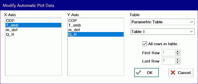The Modify Automatic Plot Data dialog allows the table, the X and Y-axis columns, and the range of rows in the table to be selected for the plot, in the same manner as originally used to develop the plot with the New Plot Window or Overlay Plot commands. If the All Rows in Table check box is selected, the controls that allow the range of data to be plotted are disabled. In this case, the plot will be update using all of the data in the selected columns of the table. If rows are added or deleted from the table, the plot will be redraw to reflect the changes.