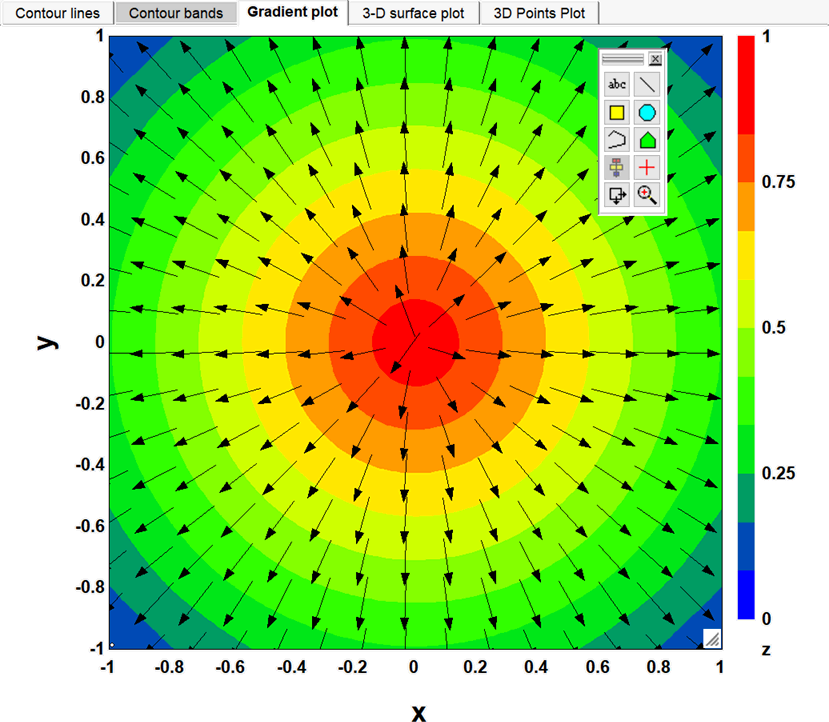 The gradient plot options appear is the gradient plot box is checked. The density and dimensions of the arrows are controlled by the sliders. The arrow length that is displayed is the maximum arrow length used in the plot. The actual length is proportional to the magnitude of the gradient values. Gradients can be superimposed on the contour plot if the Show contours check box is checked.