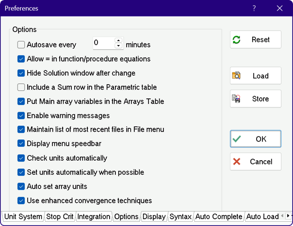 Autosave every XXX minutes instructs EES to save all information at regular intervals. The information is saved to a temporary .EES file that has the same name as the open EES file, but with a tilde (~) preceding the filename. For example, file C:\EES32\ABC.EES will be autosaved as C:\EES32\~ABC.EES. Under normal operation, the autosave file is deleted when a new file is created or opened or when EES is closed at the end of the work session, so do not depend upon it for permanent storage. You should always save any file that you intend to use at a later time using the Save or Save As commands. However, if EES quits unexpectedly, the last saved copy of the backup file should still be available in your directory.