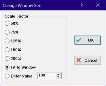 In development mode, the graphic items, text, and buttons can be resized by double-clicking the left mouse button (or clicking the right mouse button) anywhere within the Diagram window or child Diagram window except on a text, graphic item or button. On the main Diagram window, this action will bring up the following dialog window in which the size of the window can be altered On a child Diagram window, a popup menu appears with Properties and Resize window menu items. Select the Resize window menu item to bring up the following menu.