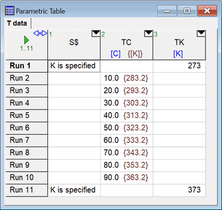 File T data.txt will, when retrieved, create a Parametric table with 3 columns and 11 rows. The first row provides the names of 3 EES variables: string variable S$, and normal variables TC and TK. The format specifications are provided. The second low provides the units of these variables. The following 11 rows provides the data that will appear in the Parametric table. Each row contains two tab characters that separate the information for each EES variable.