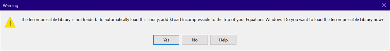If you click on the Incompressible button in the Function Information dialog before the Incompressible library is loaded, EES will offer to load the library.