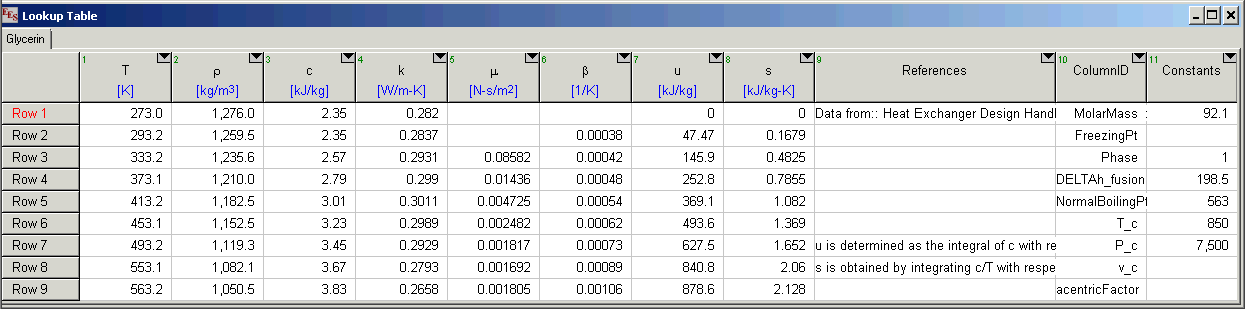 Data for incompressible substances are provided in EES Lookup tables having an .LKT filename (.LKT64 for the 64-bit version) extension. Shown below is the table for Glycerin