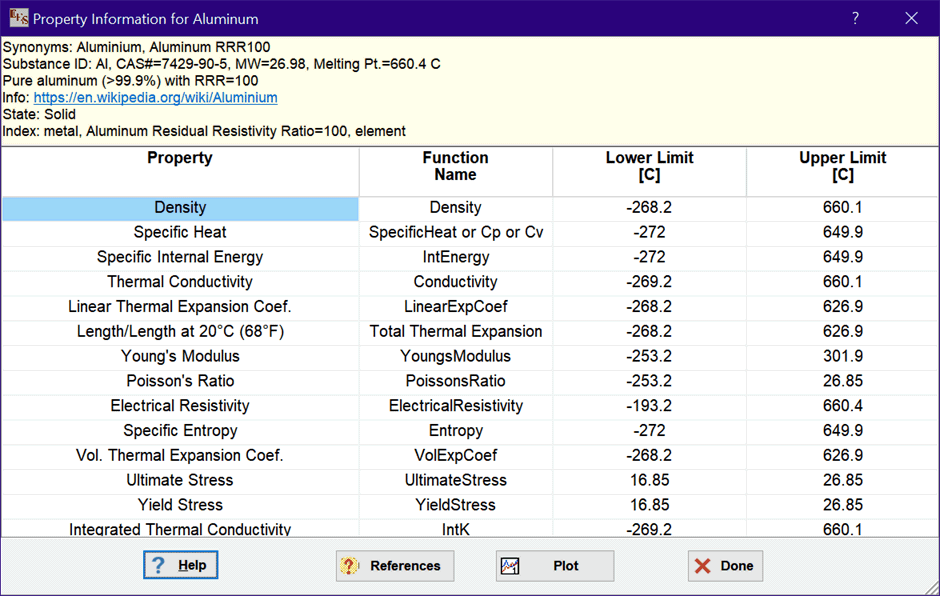 The list on the right are names of substances to which these functions can be applied. The drop-down list box in the center allows a selection criterion to be applied to the list of substances. The available selection criteria are: All data, metals, liquid metals, building materials, heat transfer fluids, insulation, molten salts, organic liquids, and miscellaneous. Some substances may appear in more than one list. Clicking the Property Info button will provide a summary of the property information available for the selected substance, as shown here for aluminum.