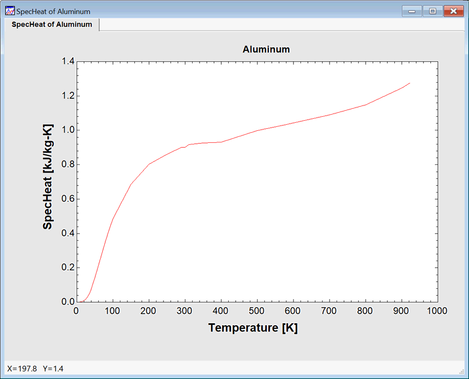 Click the References button to access the source of the property data and other information. Click the Plot button to produce of plot of the data for the selected property. A plot of the specific heat of Aluminum is shown. Note that, in some cases, the plot will not be smooth due to the fact that data may be from different sources. The plot is not splined or smoothed. If you wish, you can use the Modify Plot command to spline fit the data or to display symbols at the location of the actual data points.