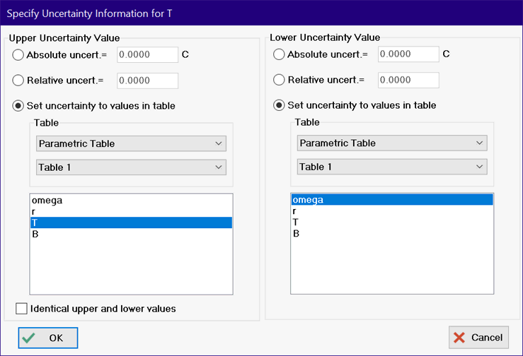 The information in this dialog is for a particular variable plotted on the X or Y-axis. In the example shown above, the variable is T. The dialog allows the uncertainty for values of the selected variable to be specified as either a constant that is taken to be the absolute value or relative value, or as a variable that is read from a column in the Parametric, Lookup, Arrays, or Integral tables.