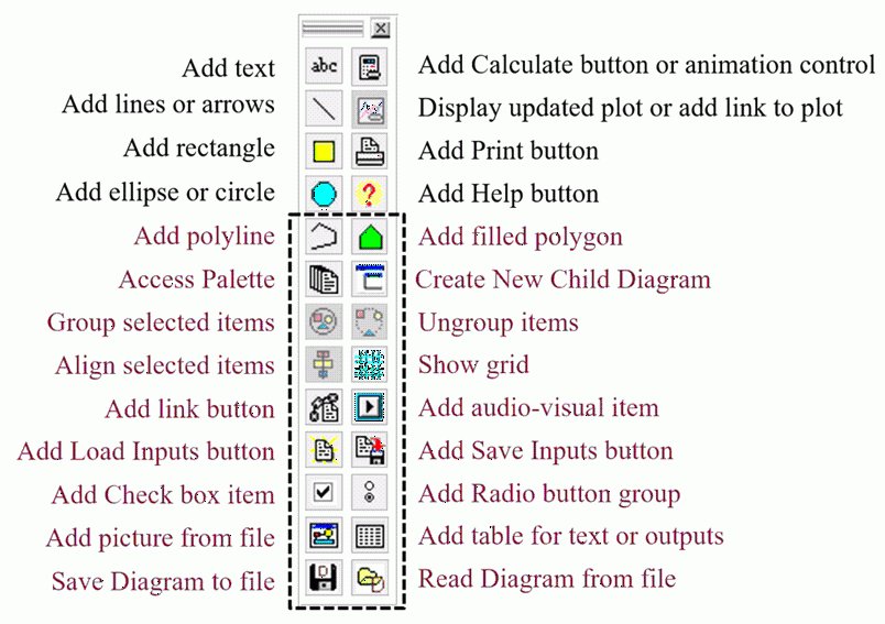 The toolbar is visible in the Diagram window or Child Diagram window when the window is in Development mode. The available tools are shown below. The buttons shown within the dotted rectangle are only available in the Professional license. A status bar will be visible at the bottom of the Diagram window whenever the toolbar is visible. The status bar shows the cursor position, the identity of the Diagram window (Main or child number) and information about the item that the cursor is positioned on.