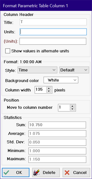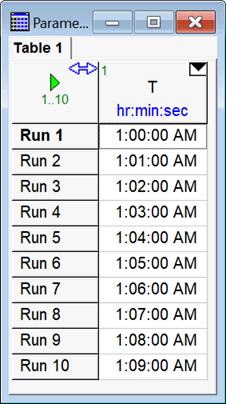The Parametric, Lookup, and Arrays tables will display variables in time format if the column is specified to be in time format. Values in time format can then be directly entered into Lookup and Parametric table cells. The specification can be made by clicking in the header cell of the table and selecting Time from the Style menu.