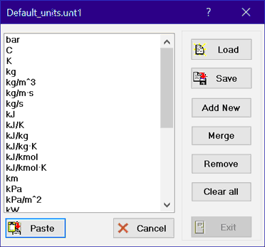 Save brings up a file save dialog that saves the current units list in a specified .unt1 or .unt2 file. The .unt1 and .unt2 files will be automatically opened if they are found in the working directory. There can be more than one .unt1 and .unit2 file. EES will automatically read the most recent file, but others can be opened with the Load command. Note: if you make a change to the units list and Exit without clicking the Save button, the changes will be in effect only for the current EES session.
