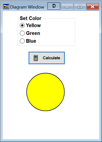 If "Execute EES commands when check status is changed" is selected, EES will attempt to execute the commands associated with the selected button directly after it is selected. This capability is most useful when the check box setting affects the display in the Diagram window in some way. The frivolous example above sets the fill color of another object named ball to yellow. A more useful application of the radio button capability would be to control the position and visibility of objects, text, and buttons on the Diagram window. For example, a Calculate button can be hidden by setting the EES variable, Name.Hide=true# where Name is the name give to the Calculate button in the Calculate Button Characteristics dialog.