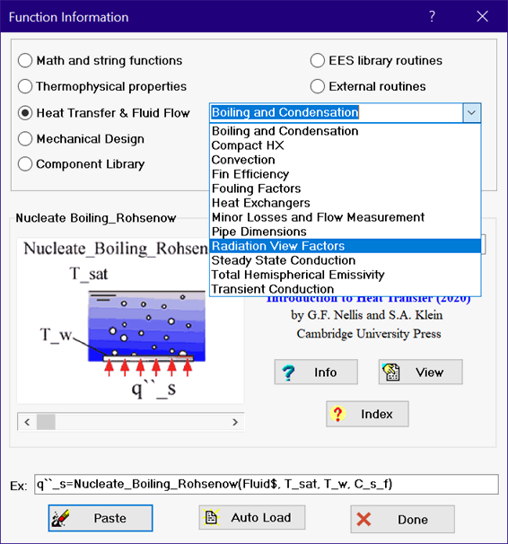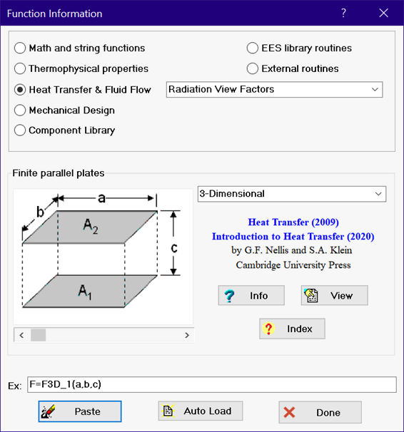 Clicking the Heat Transfer, Mechanical Design, Component Library or User-Defined buttons provides access to information on EES application libraries. The major categories in each application type appear in the drop-down list to the right of the button. For example, selecting the Heat Transfer button will cause a drop-down control to appear listing all the categories in the Heat Transfer library, as shown in the figure on the left. The figure on the right shows the result of selecting Radiation View Factors category.