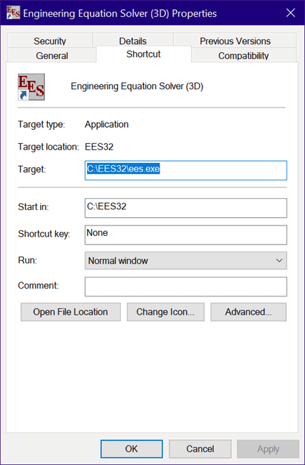Normally EES expects to find these files in the same directory as the EES application, i.e., the working directory is the directory that the EES application is in. However, when the EES application is shared by multiple users, as in a network application, it is desirable for EES to look for these files in a user-specified working directory. The best way to specify the working directory in this situation is with a shortcut. You create a shortcut by right-clicking on the EES.exe file and selecting the Make Shortcut menu item. Doing this will create a shortcut file (also called a .LNK file) with information that can be supplied to EES when it starts. Right clicking on the shortcut icon will bring up the following dialog.